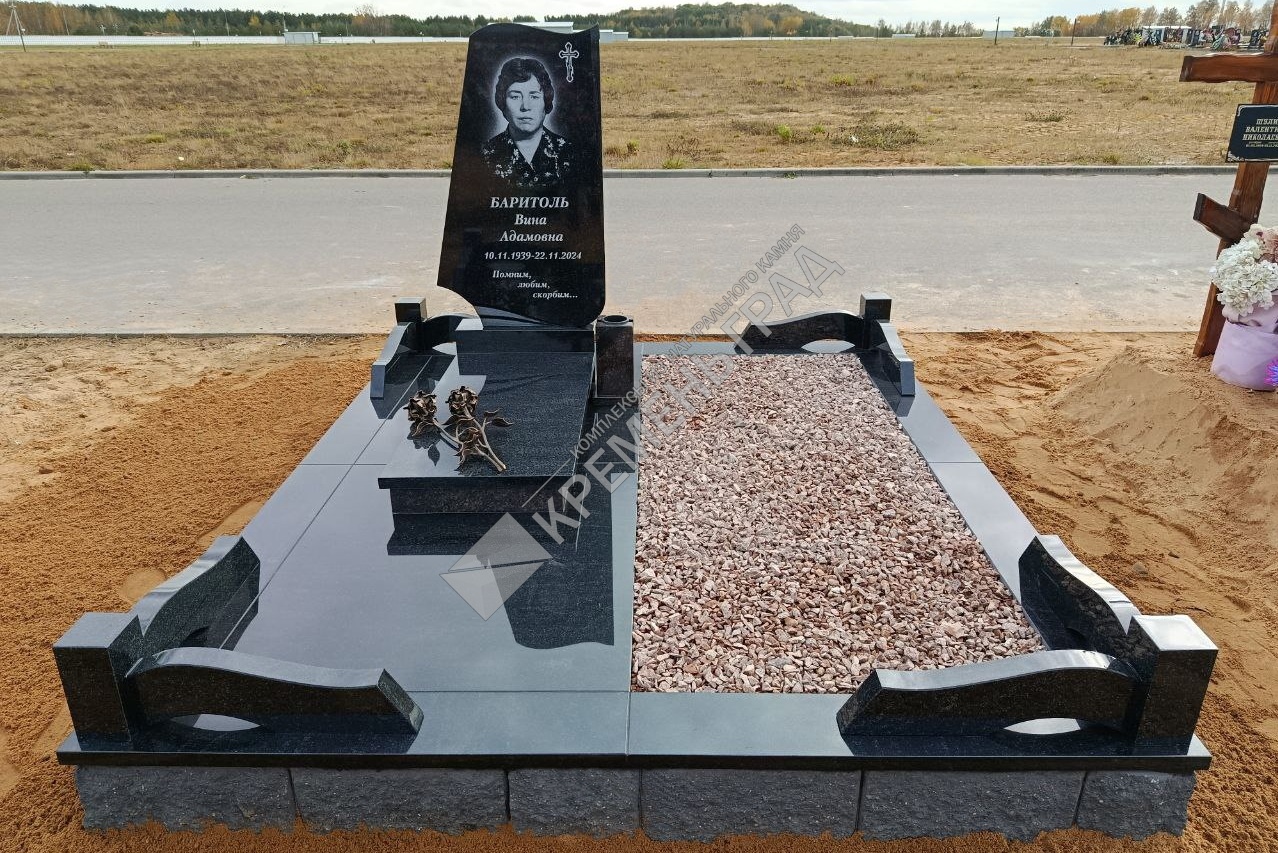 Ограда с плавными углами — повторяет контуры памятника, создавая единое стилистическое пространство. Мягкие изгибы ограды смягчают строгость гранита, делая облик мемориала гармоничным.
