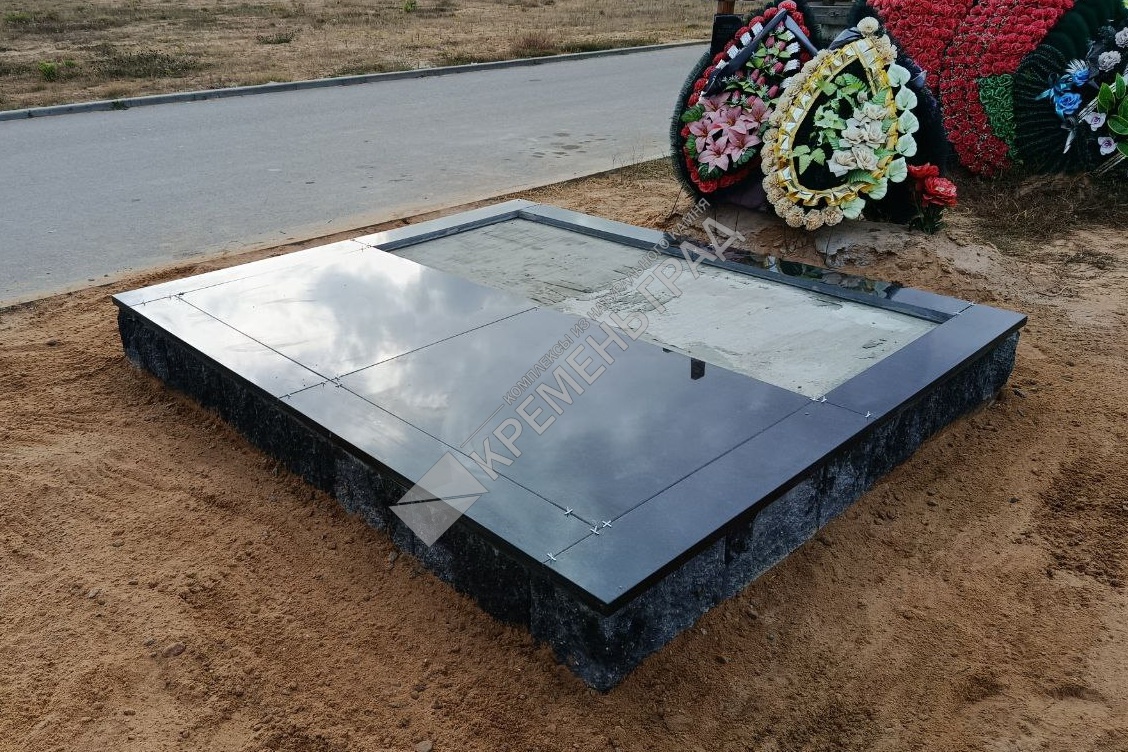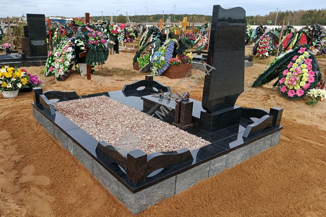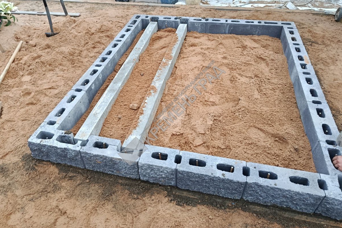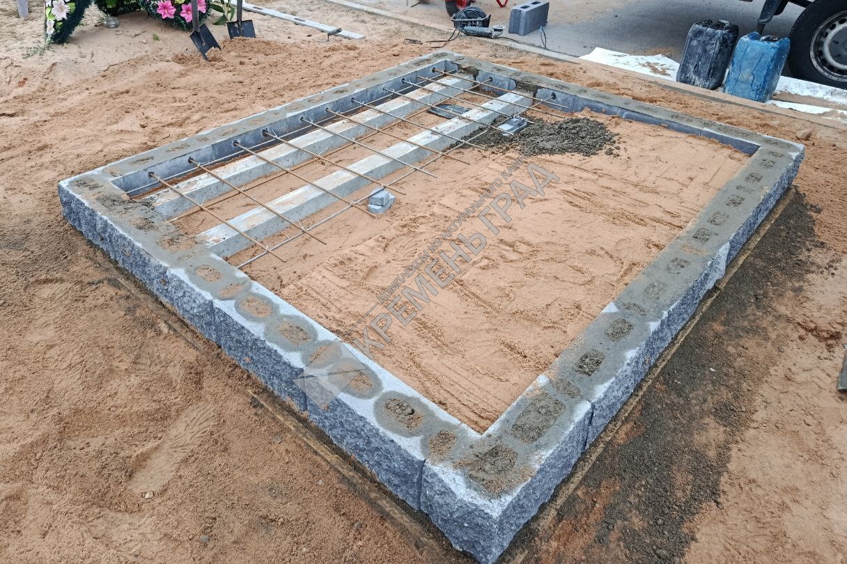 Фундамент из чёрного бессер‑блока — практичное и эстетичное решение. Монолитная основа обеспечивает устойчивость конструкции, а тёмный оттенок органично сочетается с гранитом.